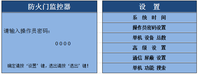 鍵,重新設(shè)置防火門監(jiān)控器的密碼,按“設(shè)置”鍵保存新密碼。